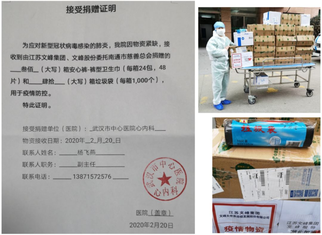 2月3日-2月28日,以南通市文峰慈善公益基金會的名義向南通大學附屬醫院、南通第三人民醫院提供后勤保障物資,包括千家惠食品、洗護用品、文峰飯店及南通大飯店半成品食材,共計約65萬元,以實際行動支持醫務工作者,解除他們生活上的后顧之憂。