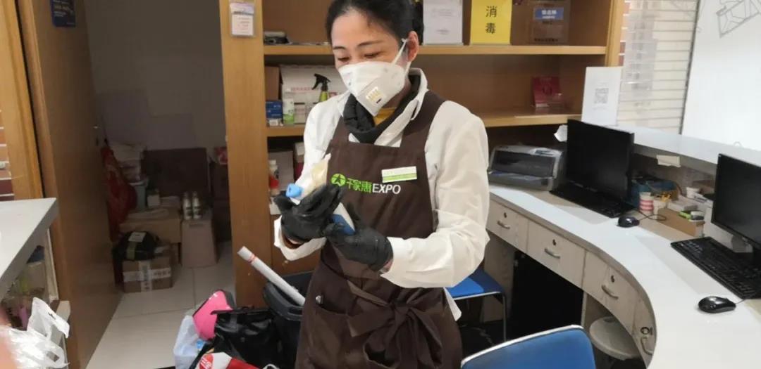 每天營(yíng)業(yè)前、營(yíng)業(yè)中和營(yíng)業(yè)后,她和同事們都要使用消毒清潔劑在店內(nèi)進(jìn)行無死角殺菌消毒,對(duì)收銀臺(tái)、邊側(cè)扶手、手推車、手提籃、服務(wù)臺(tái)、寄包柜等高頻接觸的重點(diǎn)區(qū)域,更是要每2小時(shí)就要進(jìn)行一次消殺工作。