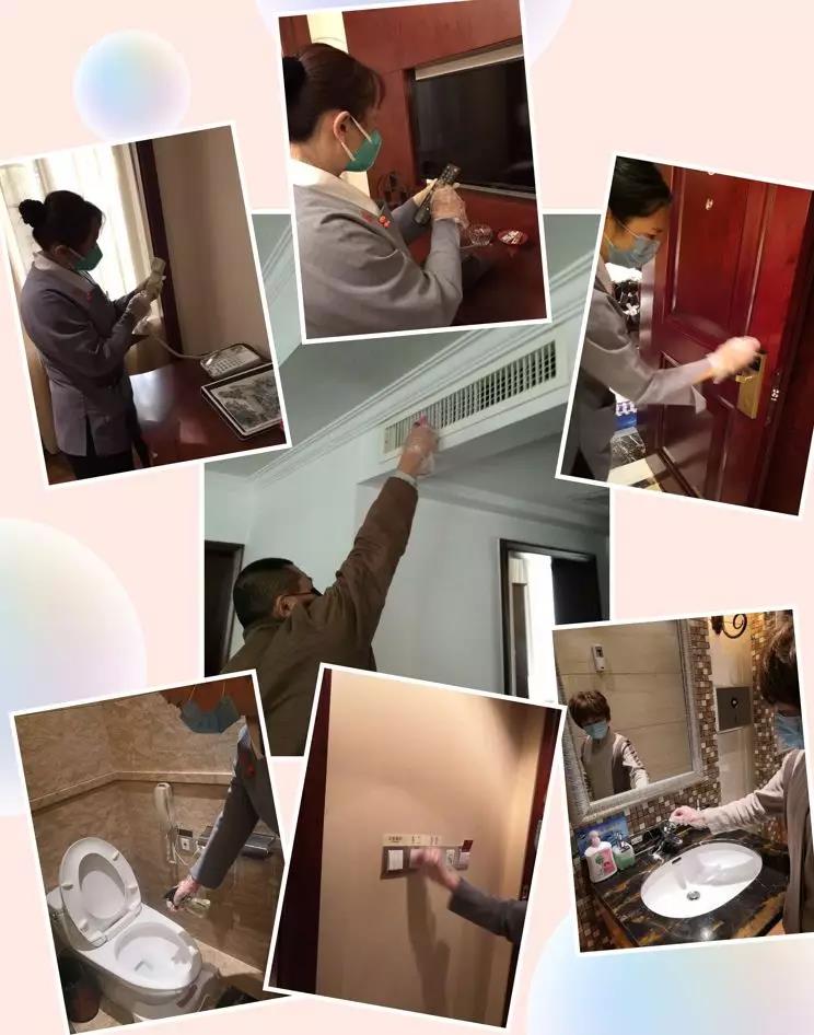 他們還將所有客用設施及公共區域每日定時進行消毒,公共設施每兩個小時進行一次化學消毒,每三個小時進行一次中藥消毒,并用顏色區分抹布,消毒液浸泡后再擦拭相應的場所,他們還建立了清潔消毒臺賬。對于客房內,他們對電話、門鈴、開關、三缸等每天消毒,并開窗通風2小時以上,棉織品高溫消毒后灌袋;有重點的對房間空調風口進行清洗、噴灑消毒。