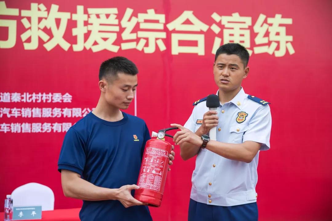 人員疏散后,針對(duì)火情該如何處置?樊中隊(duì)和消防員共同示范了滅火器的使用方法。