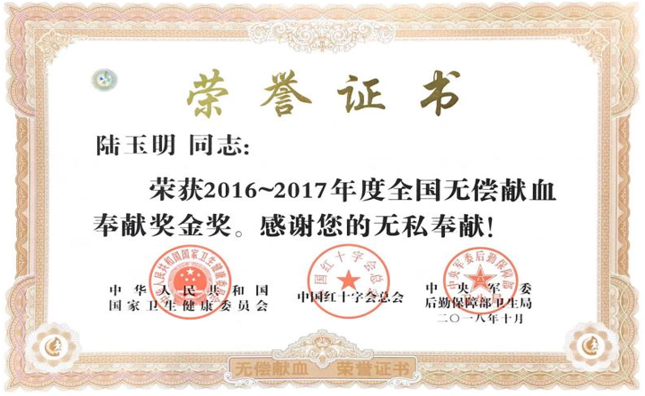 自1997年以來,陸玉明以文峰名義主動參加無償獻血至今,已無償獻血13400毫升,其中獻造血干細胞一次,并加入中華骨髓庫,同時,先后獲得2010—2011年度全國無償獻血奉獻獎銀獎、2016—2017年度全國無償獻血奉獻獎金獎。