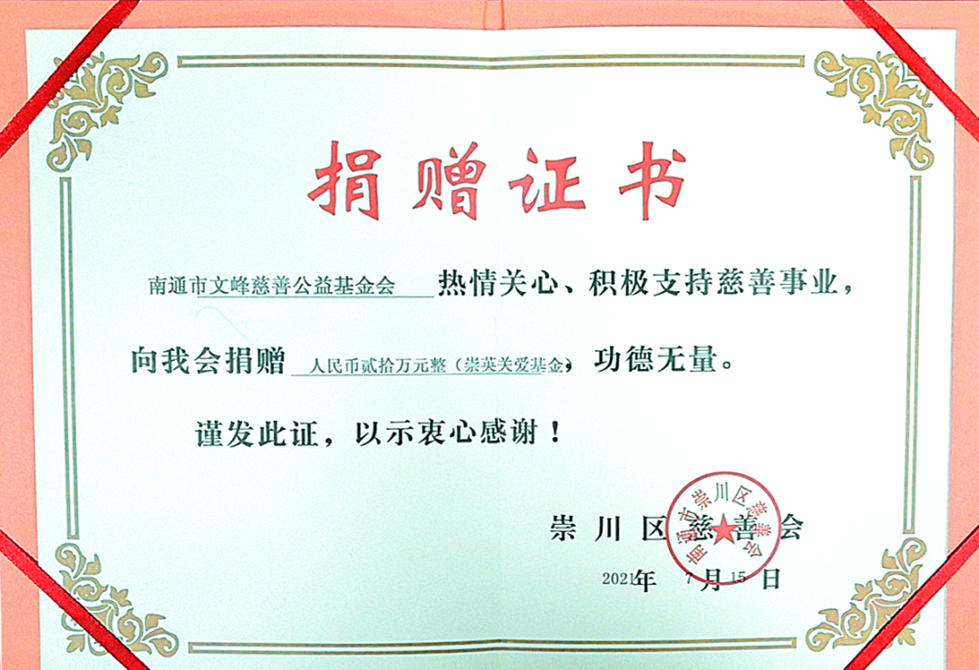 2021年9月,江蘇文峰集團榮獲“南通慈善獎”最具愛心捐贈企業稱號。