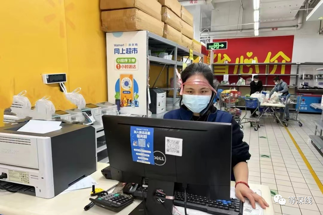 上海沃爾瑪一接單人員將電話綁在耳邊 受訪者供圖