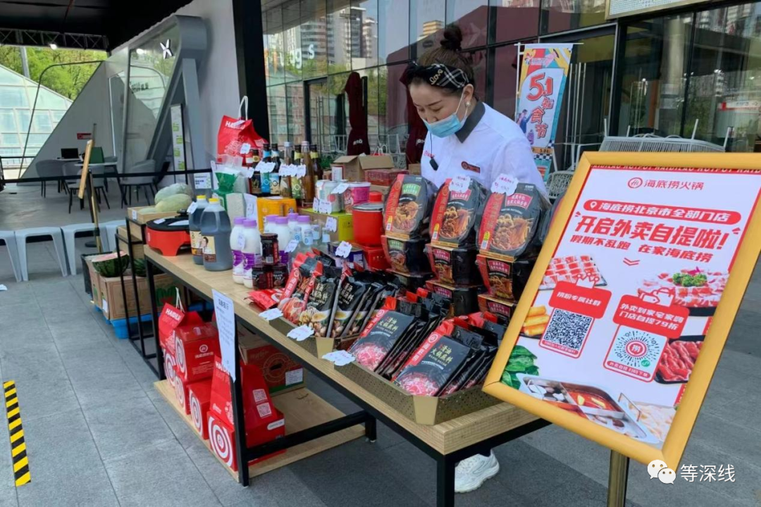 5月的北京,很多昔日繁華的商場門口,擺著一個(gè)個(gè)貨架,上面有一些水果、蔬菜和自制方便食品,赫然貼著海底撈顯眼的商標(biāo)。