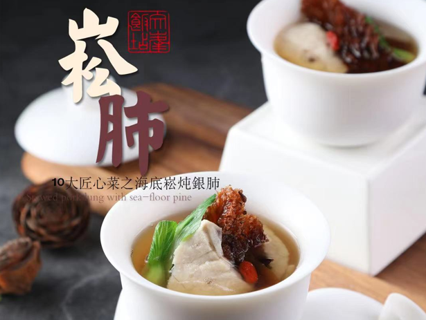 “海底松燉銀肺”是南通著名儒醫金聘之為清末狀元、著名實業家張謇量身定制的一道食療養生菜。菜肴是用本港海蜇頭與豬肺同燉而成,具有補益肺氣、止咳化痰之功效,“海底松燉銀肺”經張府流傳民間,從此成為倍受老百姓推崇的養生佳肴。本道菜的海蜇頭形似松枝,豬肺色白如銀,酥爛如豆腐,用調羹舀食,入口即化,湯清味醇,是適合老年人的可口美肴,也是張謇宴食譜的必備菜之一。