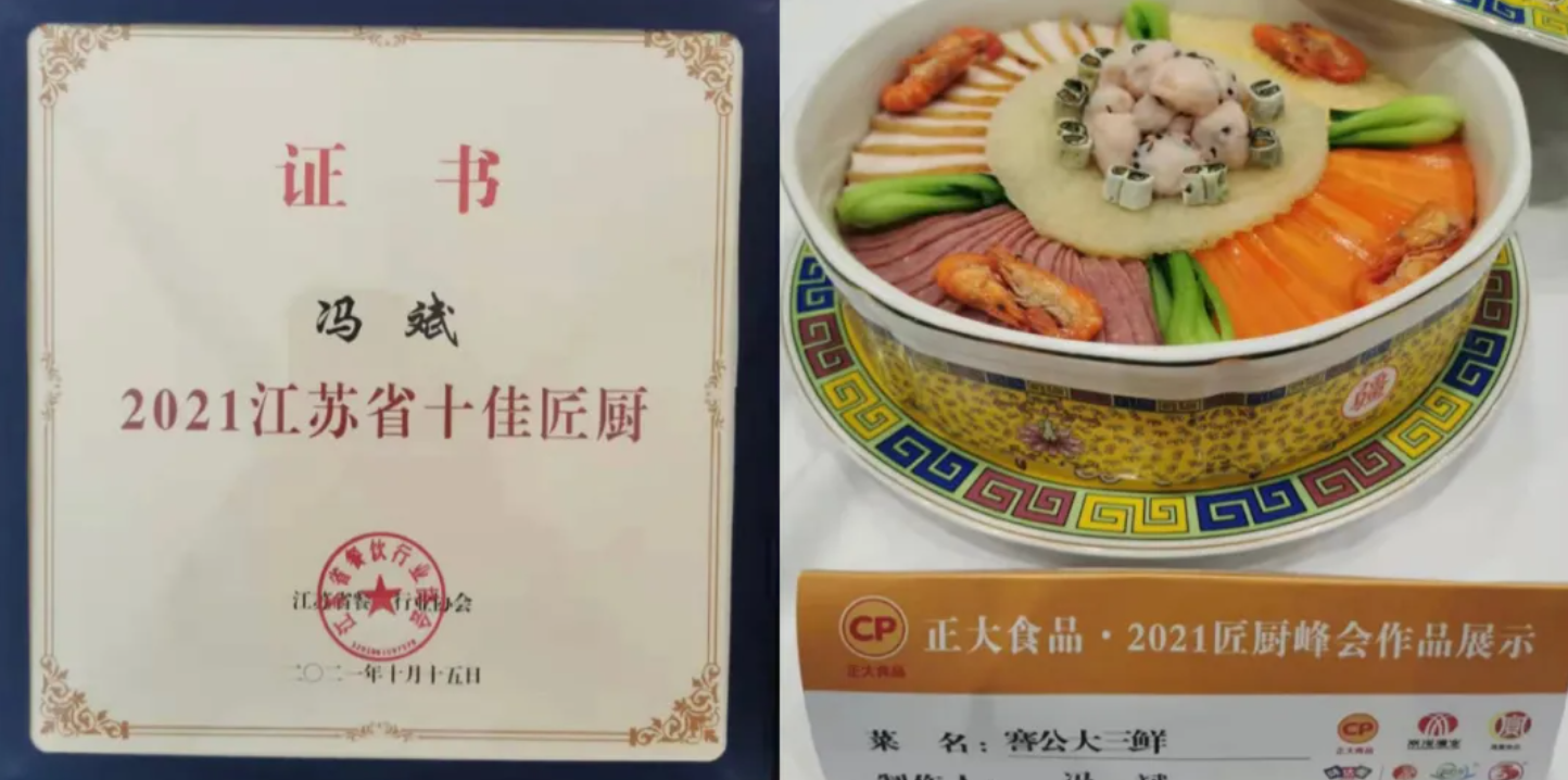 2021 年 10 月 15 日至 17 日,以“綠色餐飲、消費促進”為主題的2021第十一屆江蘇國際餐飲博覽會在南京國際展覽中心舉辦。南通大飯店行政總廚馮斌在活動中獲得了江蘇省“十佳匠廚”榮譽稱號。