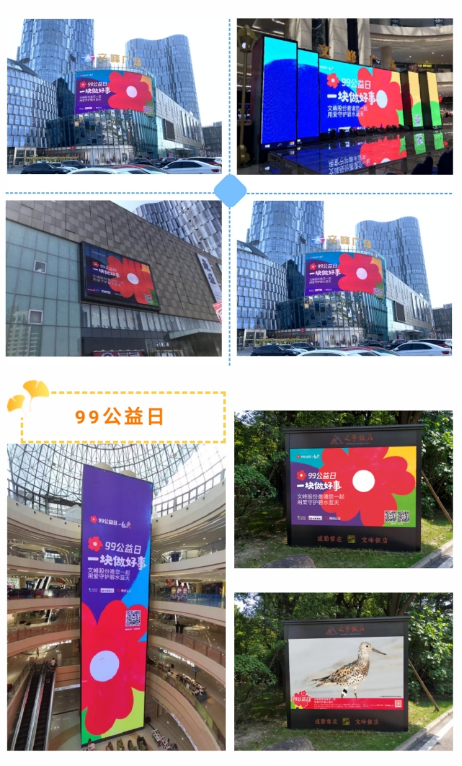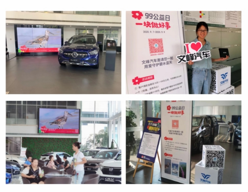 今年,文峰集團為“創(chuàng)綠家”、“勁草同行”、“守護東灘護鳥飛”等項目進行了全力的支持。集團旗下的文峰飯店、南通大飯店、南通文峰城市廣場、上海文峰廣場、大世界百貨,以及30余家文峰汽車4S門店等人流量聚集的商圈,均展出了戶內外LED屏或背景墻、易拉寶、愛心證書等,線下促銷活動也同期向廣大顧客開放。